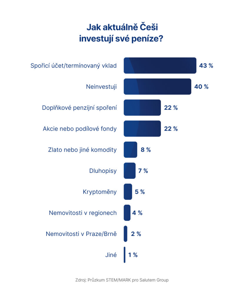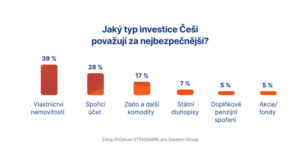Jako nejbezpečnější investici považuje 39 % Čechů vlastnictví nemovitosti. Avšak dle výsledků průzkumu nechává 43 % respondentů své peníze stále na spořicím účtu nebo termínovaném vkladu a další dvě pětiny neinvestují dokonce vůbec.