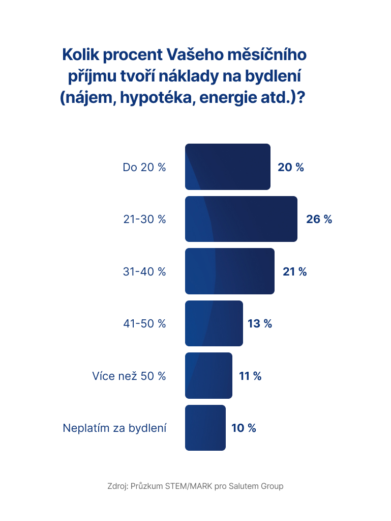 Ve svém a kompletně splaceném bydlení aktuálně žije pouze 38 % Čechů. Další téměř pětina respondentů splácí hypotéku a téměř třetina Čechů bydlí v nájmu. Náklady na bydlení jsou tak pro mnoho lidí likvidační – téměř polovina Čechů (45 %) na ně dává více než 30 % svých příjmů.