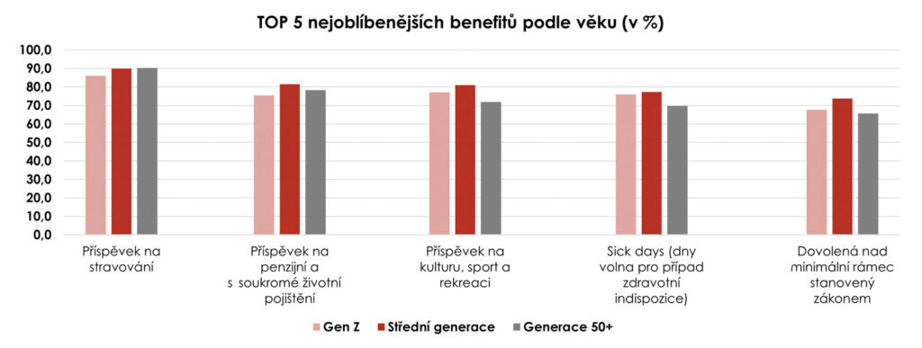 Ve výběru nejatraktivnějších benefitů mají zaměstnanci jasno. Dlouhodobě nejžádanějším z nich se v březnovém průzkumu společnosti Edenred ukázal příspěvek na stravování, který označilo za důležitý 86 % zaměstnanců generace Z (18-29 let), 90 % příslušníků střední generace (30-49 let) a 90,2 % zaměstnanců starších 50 let (50-65 let). Do pětice nejoblíbenějších benefitů (z nabídky celkem dvaceti možností) se dále podle výsledků šetření řadí příspěvek na penzijní a životní pojištění, příspěvek na kulturu, sport a rekreaci, sick days a dovolená nad rámec zákona. Tyto kategorie označilo za důležité v průměru 80 % zaměstnanců.