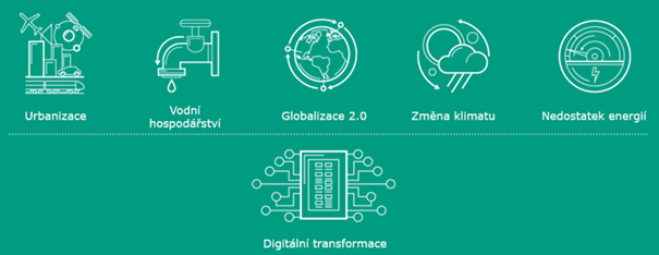 Skupina Wilo věnuje zvláštní pozornost globálním trendům jako je změna klimatu, urbanizace, nedostatek vody ale také digitalizaci a reaguje na ně následujícími megatrendy.