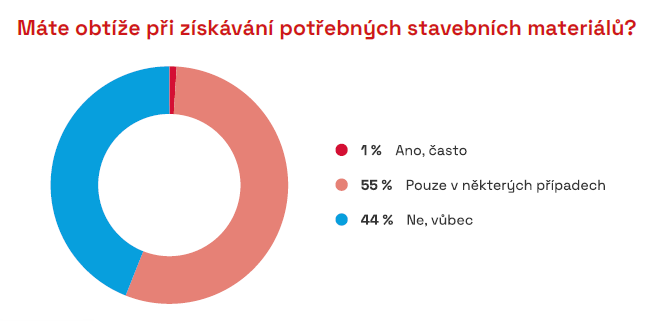 Dvě pětiny stavebních společností už nečelí obtížím spojeným s nedostatkem stavebního materiálu (44 %). Díky tomu se jim daří dodržovat smluvené termíny a plynule navazují na realizaci plánovaných projektů. Přestože většina stavebních materiálů je na trhu k dispozici, u některého zboží firmy stále řeší problémy s dostupností (55 %). Jde hlavně o specializovaný nebo hojně poptávaný materiál. Vedle výkyvů na trhu patři mezi nejčastější důvody také komplikace v logistice, nebo neočekávané zpoždění ve výrobě – a tedy i dočasná nedostupnost.
