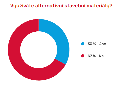 Na druhou stranu dvě třetiny respondentů zatím nevyužívají žádný z materiálů, který by nahradil tradiční stavební materiál nebo metody. Některé z firem se brání zavedení novinek třeba kvůli konzervativnímu přístupu nebo větším investicím, které by bylo třeba na začátku vložit.  Trend i přesto směřuje k udržitelnosti a inovacím, a ukazuje se, že zájem o nové nebo alternativní materiály v budoucnu nejspíš dál poroste.
