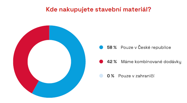 Více jak polovina společností (58 %) preferuje nákup stavebních materiálů výhradně od domácích dodavatelů. Tento trend je ovlivněn několika faktory. Primárně společnosti oceňují snadnou dostupnost zboží na lokálním trhu, projevují významnou důvěru v české podniky a usilují o podporu místního hospodářství. Dalšími motivujícími faktory jsou redukce nákladů na dopravu a eliminace komplikací spojených s mezinárodní přepravou.