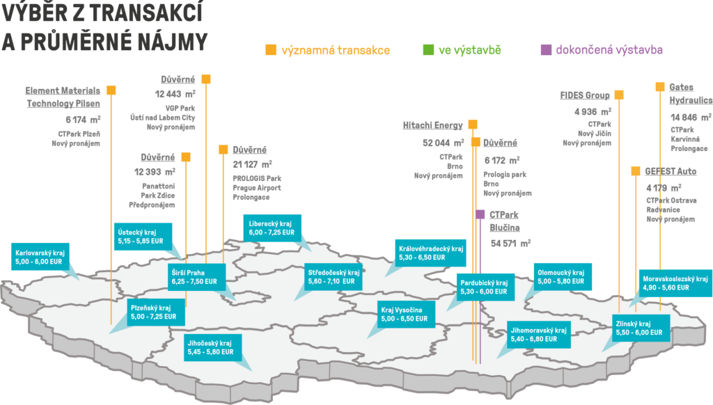 Největší nová smlouva podepsaná na konci roku 2024 se týkala CTParku Brno, kde si společnost Hitachi Energy Czech Republic s.r.o. pronajala 52 tis. m2. Druhý největší nový pronájem se uskutečnil ve VGP Park Ústí nad Labem City. V něm si významná fulfillmentová společnost pronajala necelých 13 tis. m2. Třetí největší nový pronájem posledního loňského kvartálu uskutečnila velkoobchodní firma, která si pronajala 12 tis. m2 v Panattoni Parku Zdice.