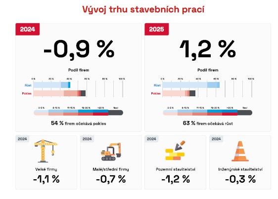 A velmi podobně vidí situaci na stavebním trhu i generální ředitel Metrostavu, Jaroslav Heran: „Pro rok 2025 jsme optimisté a předpokládáme obnovení růstu. Vycházíme z předpokladu, že zůstane zachována aktivita státu v investicích do infrastrukturních staveb, že budou v souvislosti s ekologizací energetiky a průmyslu zahajovány další významné projekty a že se v neposlední řadě v celkových výkonech stavebnictví již významněji projeví oživení bytové výstavby, ke kterému pozvolna dochází již od konce loňského roku. Celkový výsledek za rok 2025 může být samozřejmě ještě ovlivněn řadou vlivů. Pozitivně se může projevit další snižování úrokových sazeb bankovních úvěrů a hypoték, nebo oživení investiční aktivity malých a středních municipalit. Velmi vážně by mohlo celé stavebnictví negativně zasáhnout případné nezvládnutí přechodu na digitalizaci stavebního řízení a jeho zablokování na delší dobu, nebo pokud by například došlo k významnému krácení veřejných rozpočtů v této oblasti.“