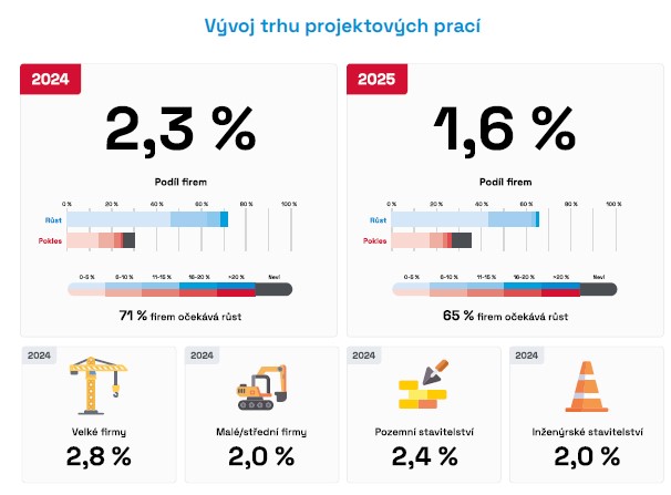 Trh projektových prací by měl růst do konce roku 2024 až o 2,3 %. Tento trend bude pokračovat také v roce 2025, a to o dalších až 1,6 %. Predikce pro příští rok jsou o něco méně optimistické než pro rok letošní. Společnosti, které se věnují převážně projektování inženýrských staveb, očekávají i v roce 2025 dostatek zakázek v rámci dopravní infrastruktury, a to zejména ze strany Ministerstva dopravy ČR. Obtíže ale vnímají u svých personálních kapacit, které mají téměř maximálně vytížené, což jim znemožňuje další zakázky přijímat. To se stává již pravidlem a výjimkou není ani tento rok, kdy projektové společnosti hlásí vytížení svých personálních kapacit na 93 %. Stavebnictví dlouhodobě bojuje s nedostatkem kvalifikované pracovní síly, a také se stále klesajícím počtem absolventů technických oborů na středních i vysokých školách. Vláda se snaží na tento problém reagovat v rámci programu Strategie vzdělávací politiky.