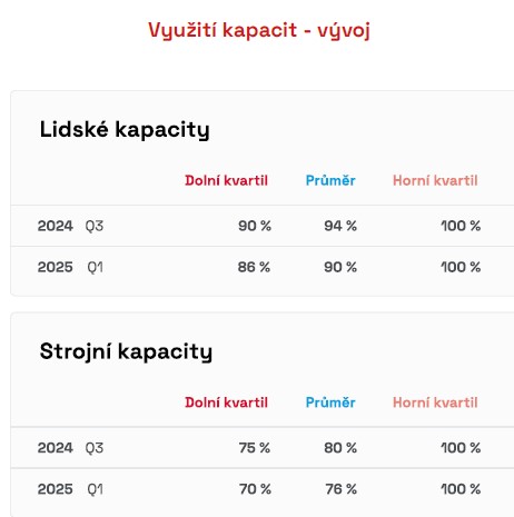 Využití kapacit ve stavebním sektoru zůstává na vysoké úrovni, podobně jako u projektových firem. Aktuálně jsou lidské zdroje ve firmách využity z 94 %, což naznačuje intenzivní pracovní nasazení a vysokou poptávku po stavebních projektech. Naplnilo se tedy ještě více očekávání z jarních měsíců tohoto roku, kdy se s nástupem stavařské sezony očekávalo 92 % vytíženosti kapacit. Strojní kapacity firem jsou v současnosti využity z 80 %. Tato vytíženost odráží robustní činnost v odvětví. Přesto se v prvním čtvrtletí roku 2025 očekává mírný pokles, kdy by využití lidských kapacit mělo klesnout na 90 % a strojních na 76 %, kde se právě opět odrazí sezónnost v odvětví.