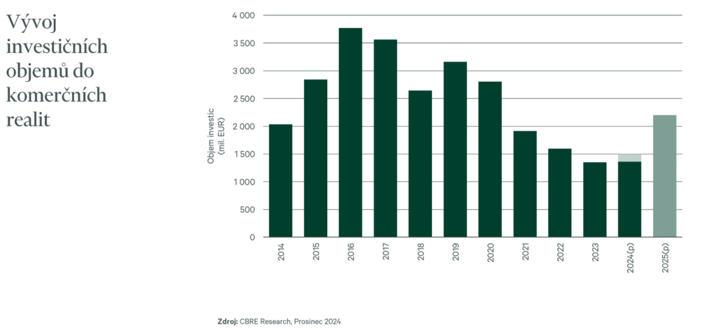 Experti CBRE očekávají, že nastartované oživení investic do komerčních realit v České republice bude pokračovat i v roce 2025. Klíčovými faktory bude nárůst nabídky vhodných realit na prodej, a dále postupné zlepšení podmínek financování.