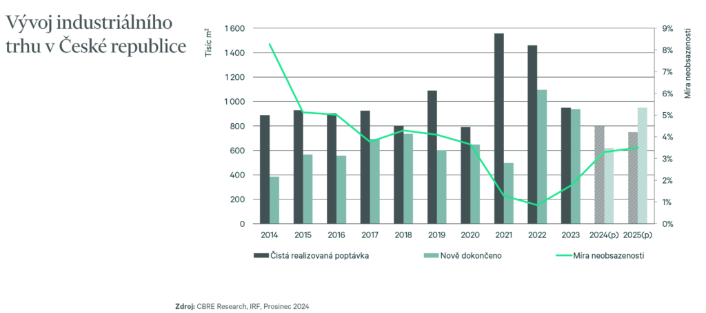 Letos by měl objem nově pronajatých průmyslových a logistických prostor dosáhnout cca 800 000 m², což představuje meziroční pokles o 15 %. Příští rok by objemy pronájmů měly podle CBRE setrvat na stejné úrovni anebo lehce poklesnout. Každopádně ve čtvrtém čtvrtletí 2024 došlo k mírnému oživení nové poptávky, což je pozitivní signál po chladnějším zahájení tohoto roku.