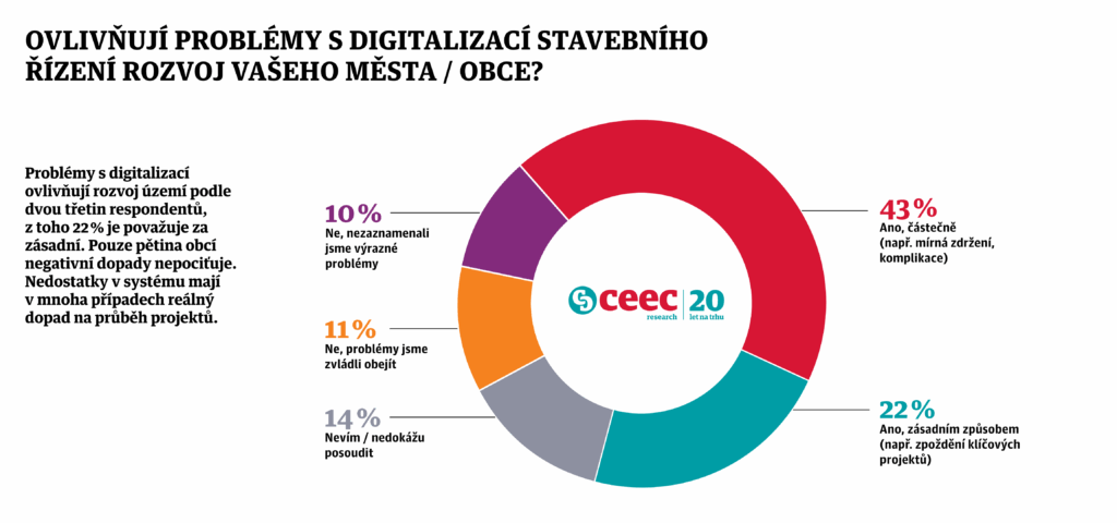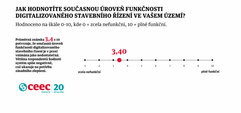 Digitalizace stavebního řízení je i nadále výraznou překážkou pro rozvoj měst a obcí. Podle aktuálního průzkumu CEEC Research, do kterého se v červnu zapojilo 961 respondentů z řad samospráv, považuje 65 % zástupců měst, obcí a krajů současný stav digitalizace za problematický. Pouze pětina respondentů negativní dopady nepociťuje. Z průzkumu rovněž vyplývá, že digitalizace stavebního řízení v praxi stále nefunguje podle očekávání. Na škále od 0 (zcela nefunkční) do 10 (plně funkční) udělili zástupci měst systému průměrnou známku 3,40.