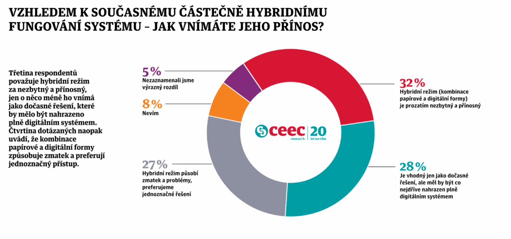 Podle 43 % respondentů způsobuje aktuální podoba DSŘ mírná zdržení a komplikace. Podle 22 % zástupců měst a obcí zpožďuje zásadně klíčové projekty a brzdí rozvoj území. 10 % respondentů nezaznamenává výrazné problémy a 11 %zvládlo technické problémy obejít. Pozitivem je vnímáno zřízení hybridního režimu, který kombinuje papírové a digitální formy řízení. Třetina respondentů (32 %) ho považuje za přínosný a nezbytný. Naopak podle 28 % zástupců veřejné sféry jde jen o dočasné řešení, které by měl plně nahradit digitální systémem.