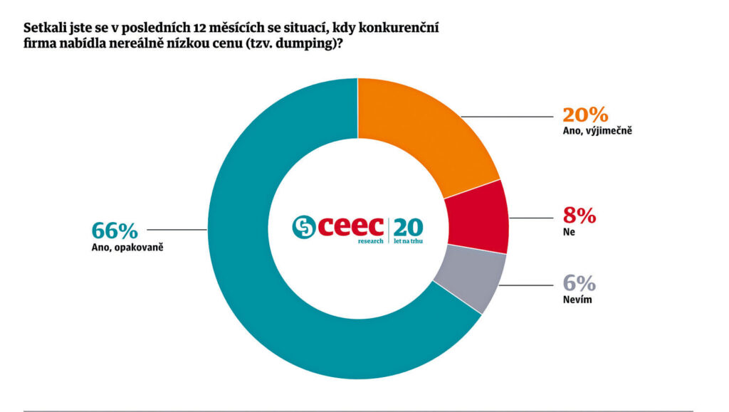 Abnormálně nízké nabídky deformují trh. 66 % stavebních firem uvedlo, že se s dumpingem v tenderech setkává opakovaně. Dvacet procent firem pak výjimečně a pouze 8 % firem uvedlo, že tento problémem při veřejných zakázkách neregistruje. Vyplývá to z letošního průzkumu CEEC Research, do kterého se zapojilo 165 stavebních firem. „Soutěžení na co nejnižší cenu je dávno překonané a škodlivé. Společnosti často nabízejí cenu, která jim nepokryje ani přímé náklady. Dochází tak k destrukci subdodavatelského řetězce, z již tak personálně poddimenzovaného stavebnictví odcházejí další lidi, protože je firmy nedokáží adekvátně zaplatit,“ doplnil Tomáš Koranda, předseda představenstva společnosti HOCHTIEF.