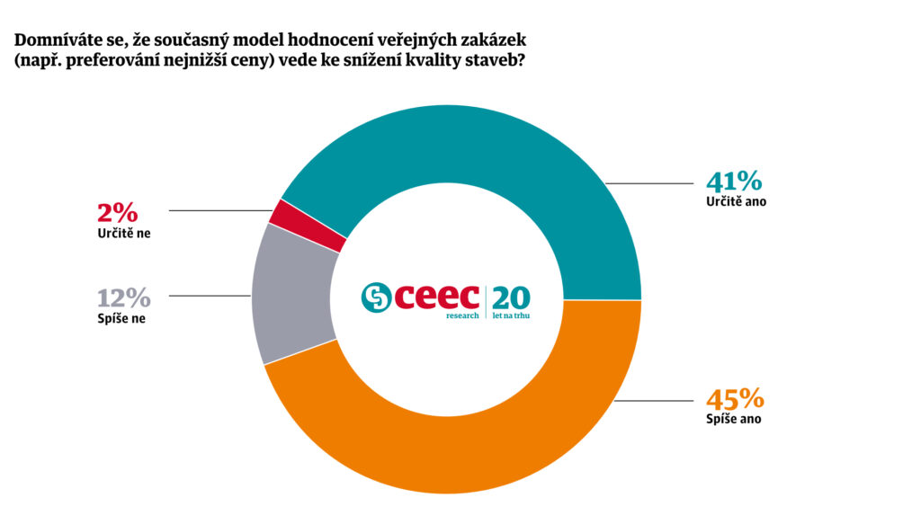 Podle drtivé většiny stavebních firem (86 %) je hlavním důvodem, proč někteří konkurenti podávají extrémně nízké cenové nabídky, snaha za každou cenu uspět v tendru – bez ohledu na skutečné náklady či dlouhodobou udržitelnost projektu. Podle 41 % dotázaných tento přístup výrazně degraduje kvalitu výstavby, dalších 45 % jej vnímá jako faktor, který ji alespoň částečně oslabuje. Výsledkem je tlak na zhotovitele, aby minimalizovali náklady – často na úkor použitých materiálů.