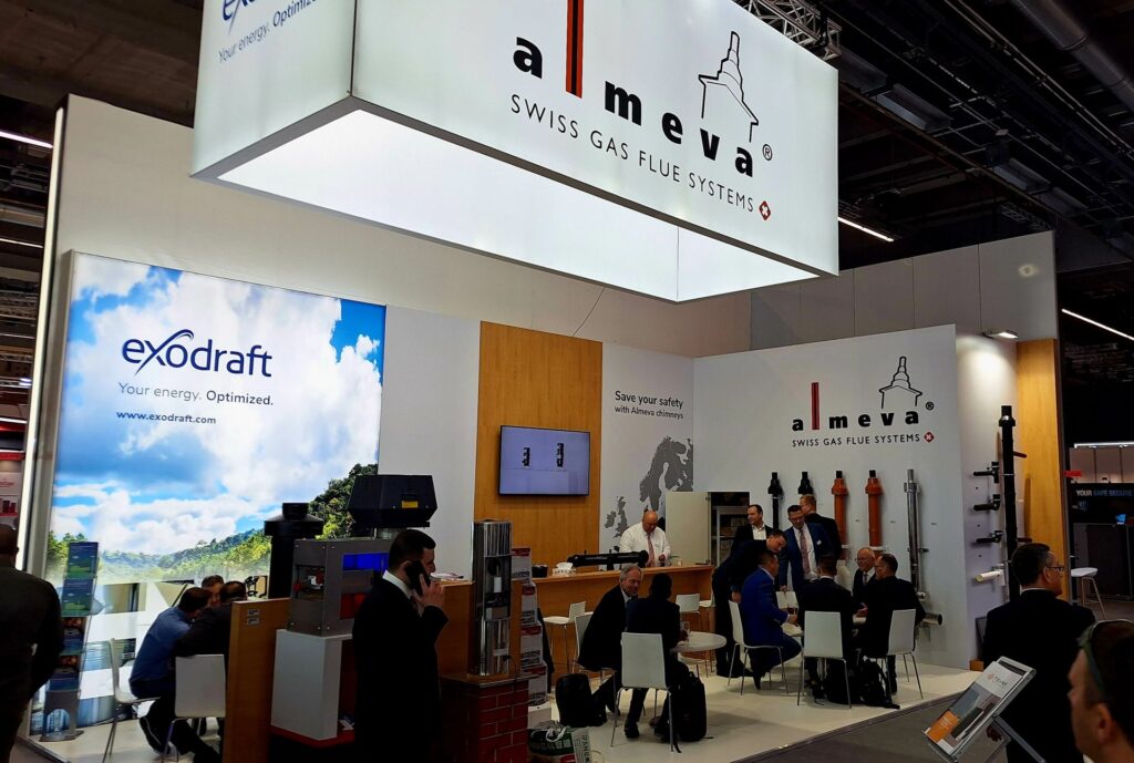 „Jako součást švýcarské skupiny ALMEVA jsme si vzali celý veletrh na starosti my,“ říká Pavel Mareček, CEO společnosti ALMEVA a vysvětluje: „Němci se za komíny stydí, ale přitom je nadevše jasné, že to prostě bez komínu ještě dlouho v Evropě nepůjde. A průmysl se bez komínu neobejde ani v létě. Takže jsme přizvali i partnera EXODRAFT z Dánska, se kterým nabízíme produkt zpětného získávání tepla ze spalin (zinkovny, pekárny, slévárny apod.), kde energie těmi komíny jdou někdy pánu Bohu do nebes. Prostě my neporučíme fyzice, jak se to naučili europoslanci, že se má od stolu snížit emise, ale umíme správnou volbou technologií ušetřit energie a tím potažmo ušetřit trocha toho fosilního mixu.“