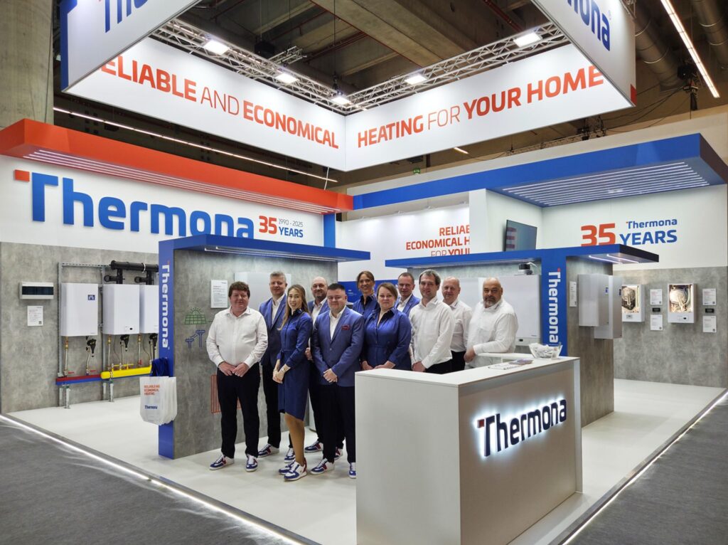 V sekci věnované výrobě tepla se představuje další tradiční česká firma Thermona, která na veletrhu ukazuje stávající již etablované výrobky, jako jsou plynové kondenzační kotle nebo elektrokotle, ale rovněž hned dvě řešení pro udržitelnější budoucnost. Zvažované omezení podmínek provozu nových plynových kotlů od roku 2029 totiž rozhodně neznamená konec plynových kotlů. V současné době již není na trhu s plynovými kotli a elektrokotli jiná firma s ryze českou kapitálovou účastí. Takřka všechny ostatní z tohoto segmentu trhu změnily majitele a patří zahraničním firmám. Taky proto jsme je na veletrhu ISH navštívili.