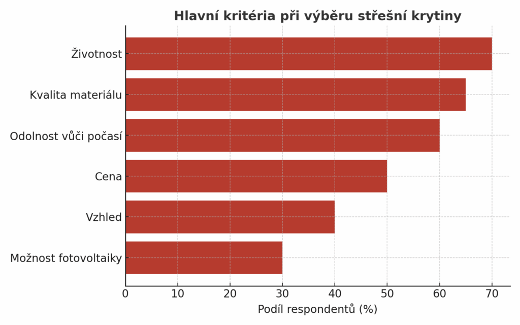 Podle průzkumu kladou Češi při výběru střechy největší důraz na životnost, odolnost a kvalitu. Krytina by měla bez problémů zvládat mráz, déšť i silný vítr po desítky let a přitom nevyžadovat složitou údržbu. Na životnost má velký vliv také prostředí, ve kterém se dům nachází. V horských a podhorských oblastech musí střecha odolat vysoké sněhové zátěži a mrazu, ve větrných lokalitách je nutná krytina odolná vůči nadzvednutí větrem a v zastíněných místech zase čelí vyšší vlhkosti a riziku vzniku mechů či lišejníků. „Střešní tašky vydrží i mnohem vyšší zátěž krup, než jaká se v Česku běžně vyskytuje,“ dodává Lubomír Horáček z Aliance taškových střech (Alitas).