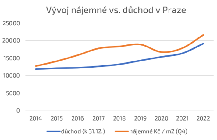 Výše starobního důchodu je ve vztahu k nájemnému v Praze nedostatečná dlouhodobě