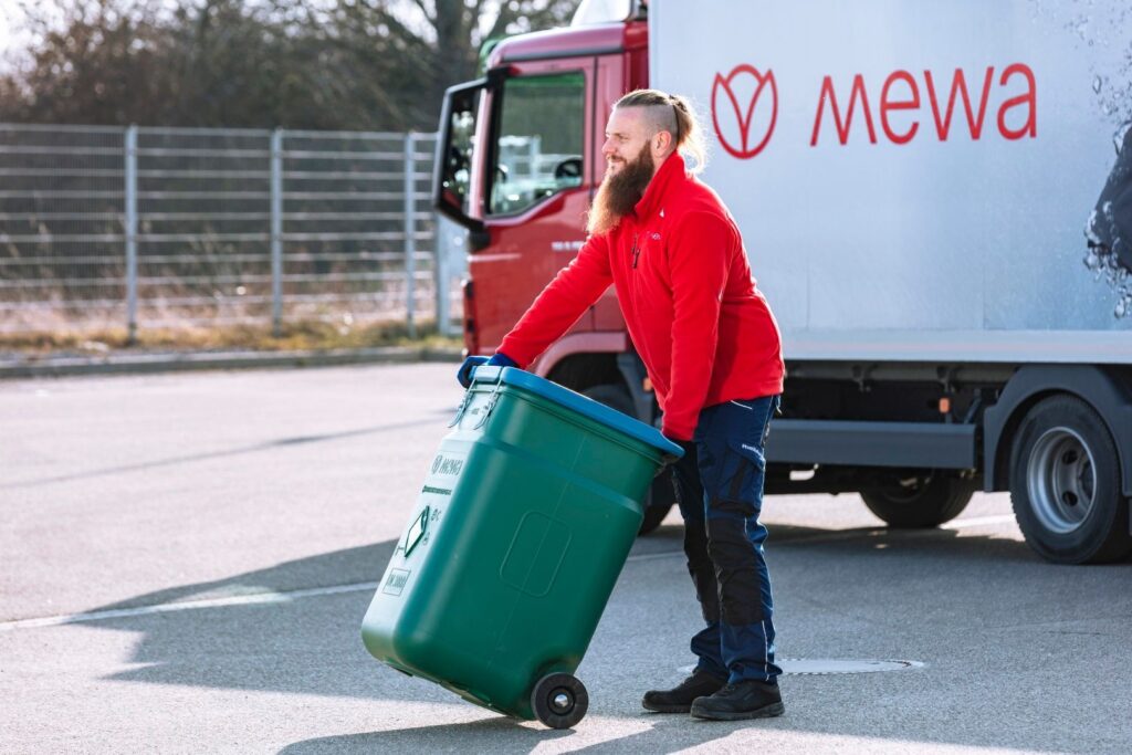 - Bezpečné skladování: Po použití se znečištěné textilie bezpečně uloží do kontejneru. Tyto bezpečnostní nádoby z odolného plastu dodávané společností Mewa jsou nedílnou součástí systému. Lze je přemisťovat, stohovat a jsou schváleny pro přepravu nebezpečného zboží.