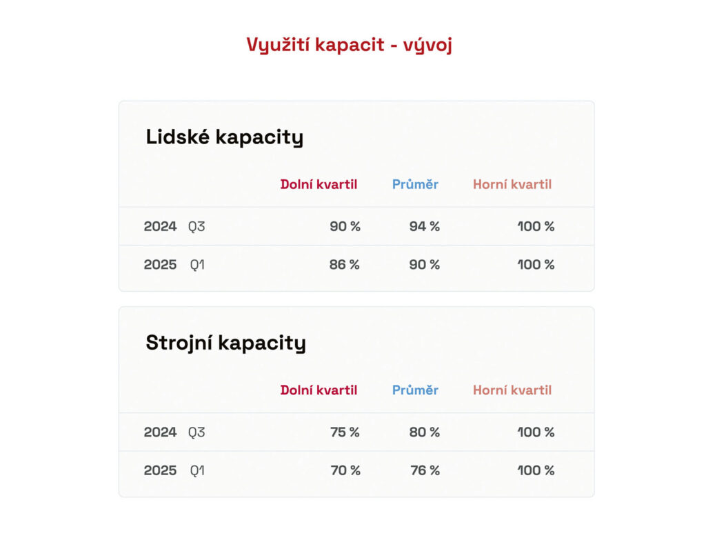 Využití kapacit ve stavebním sektoru zůstává na vysoké úrovni. Aktuálně jsou lidské zdroje ve firmách využity z 94 %, což e stavebnictví naznačuje intenzivní pracovní nasazení a vysokou poptávku po stavebních projektech. Strojní kapacity firem jsou v současnosti využity z 80 %. Tato vytíženost odráží robustní činnost v odvětví. Přesto se v prvním čtvrtletí roku 2025 očekává mírný pokles, kdy by využití lidských kapacit mělo klesnout na 90 % a strojních kapacit na 76 %, což souvisí se sezónností v odvětví.