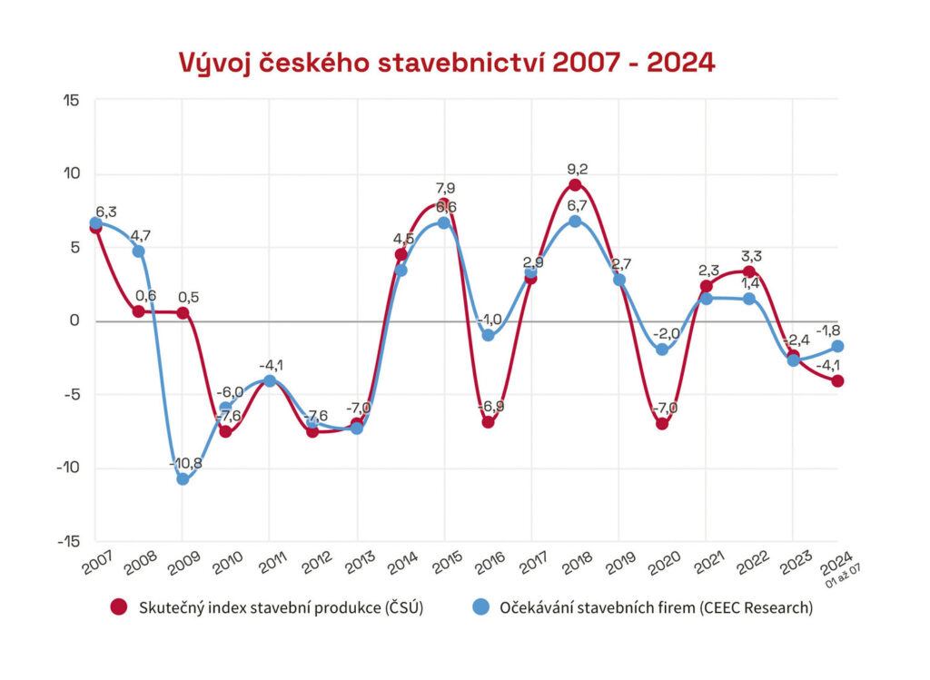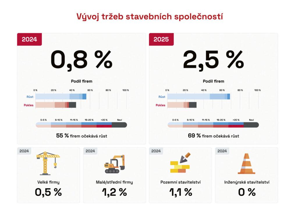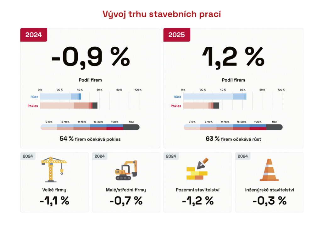 Podle aktuálních názorů ředitelů stavebních firem se situace v českém stavebnictví v roce 2024 bude nadále zhoršovat, a to s očekávaným poklesem trhu stavebních prací o 0,9 %. Tento vývoj je ovlivněn několika faktory, jako jsou změny v legislativě, rostoucí ceny stavebních materiálů a celková setrvačnost trhu. I když je výhled na rok 2025 ve srovnání s výsledky Kvartální analýzy českého stavebnictví z druhého čtvrtletí tohoto roku o něco méně optimistický, společnosti zůstávají nadále pozitivní. Ředitelé stavebních společností předpokládají, že dojde ke změně na trhu a stavebnictví se v roce 2025 opět vrátí k růstu, který by měl podle jejich názoru dosáhnout až 1,2 %. Tento růst podle jejich názoru podpoří oživení ekonomiky a zvyšující se investice do infrastrukturních projektů. Ředitelé stavebních společností se shodují, že po překonání současných výzev může následovat období růstu, které nejen obnoví tempo minulých let, ale také přinese nové příležitosti pro rozvoj celého odvětví.