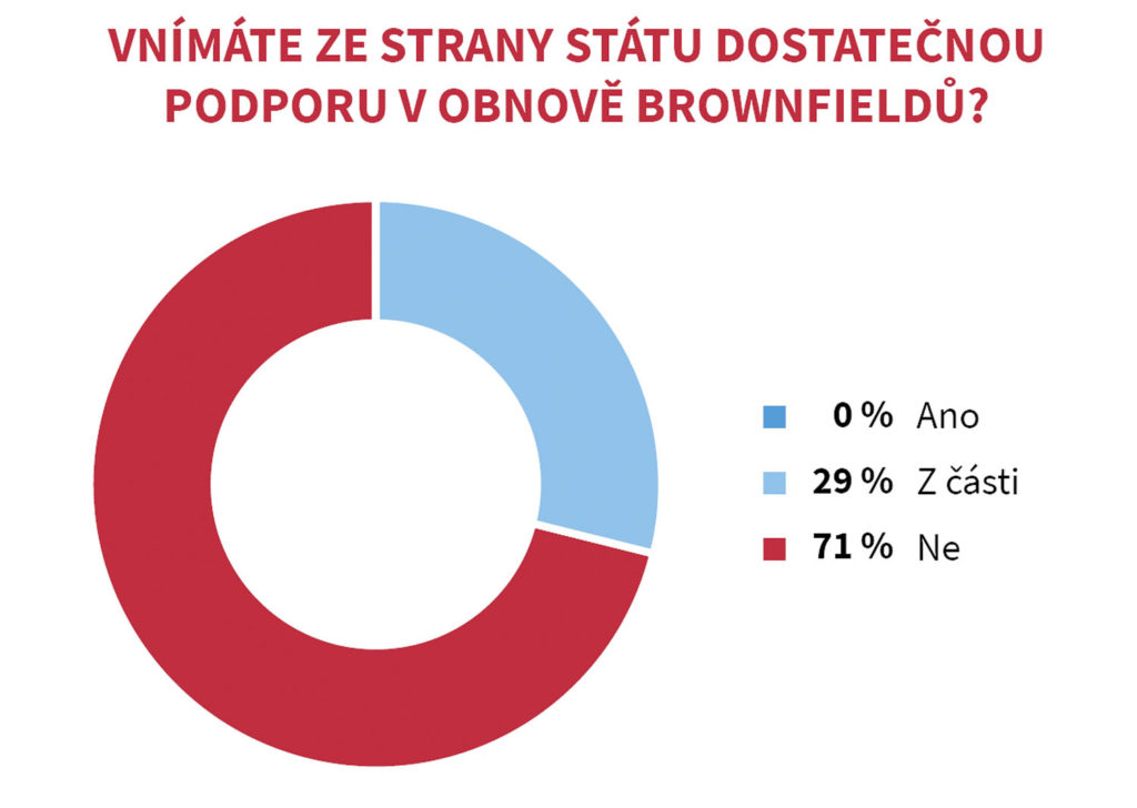Developeři postavili v brownfieldech v průměru až 29 % všech svých projektů. Téměř tři čtvrtiny dotázaných je názoru, že stát nedostatečně podporuje obnovu těchto parcel, které se mnohdy nachází v atraktivních lokalitách měst (71 %). Zbylých 29 % cítí podporu při revitalizaci brownfieldů ze strany státu pouze zčásti.