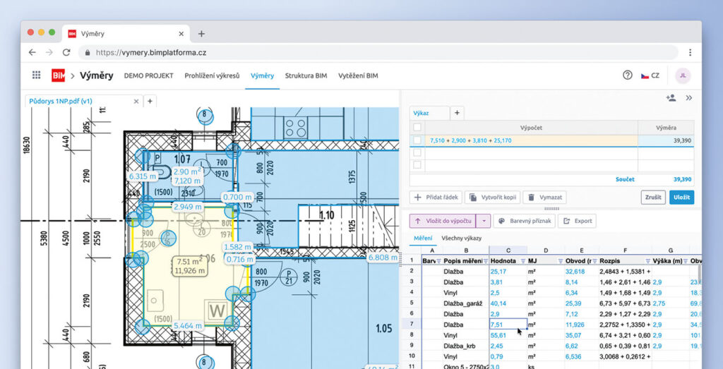 Jedno sdílené online prostředí BIM platformy. V něm vznikají všechny podklady pro výpočet množství položek (výkaz výměr), ať už z PDF či DWG výkresů nebo z BIM modelu. Každý výpočet je navázán na projektovou dokumentaci a je okamžitě dohledatelný.