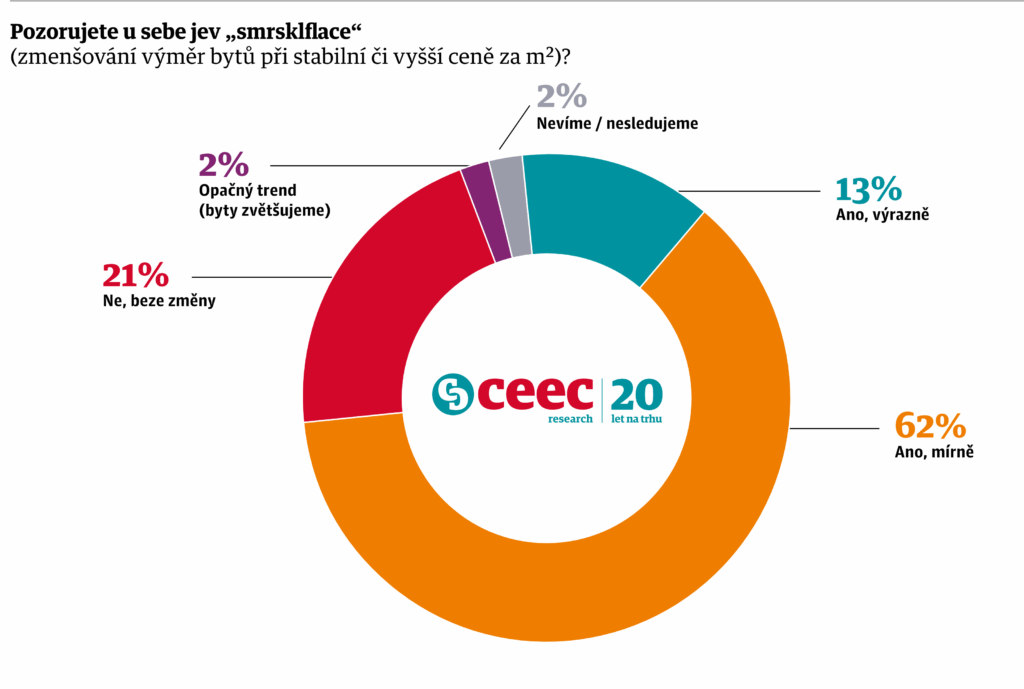 Z průzkumu CEEC Research rovněž vyplývá, že 62% developerů vnímá trend smrskflace jako mírný, zatímco 13% jej považuje za výrazný. Naopak 21% respondentů nezaznamenalo žádnou změnu a 2% vnímají opačný vývoj.