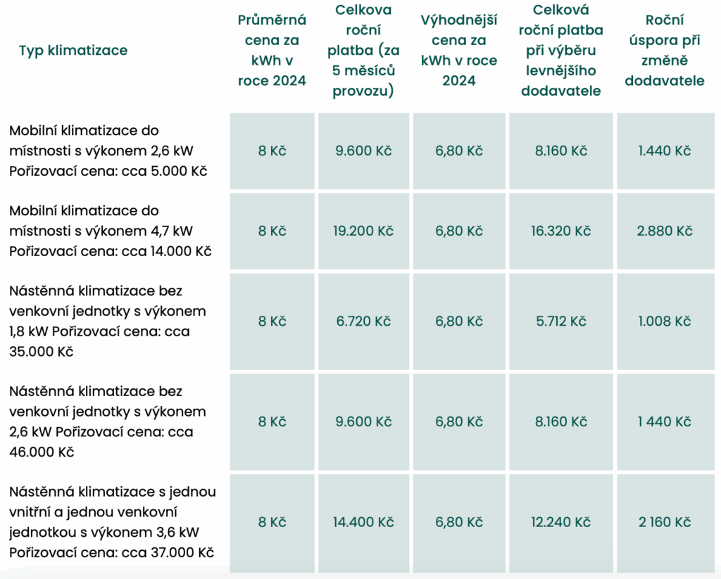 „Výslednou roční spotřebu je pak třeba vynásobit vaší sazbou za elektřinu. Průměrná cena za 1 kWh se aktuálně pohybuje kolem 8 Kč, existují ale i mnohem výhodnější ceníky. Změnou dodavatele a výběrem příznivější nabídky můžete na jedné kWh ušetřit víc než korunu. Možná se to nezdá jako hodně, ale pokud sáhnete po klimatizaci s roční spotřebou kolem 5 MWh, změnou dodavatele byste mohli ušetřit přes 5 000 Kč za rok,“ vypočítává Lukáš Kaňok z Kalkulátor.cz.