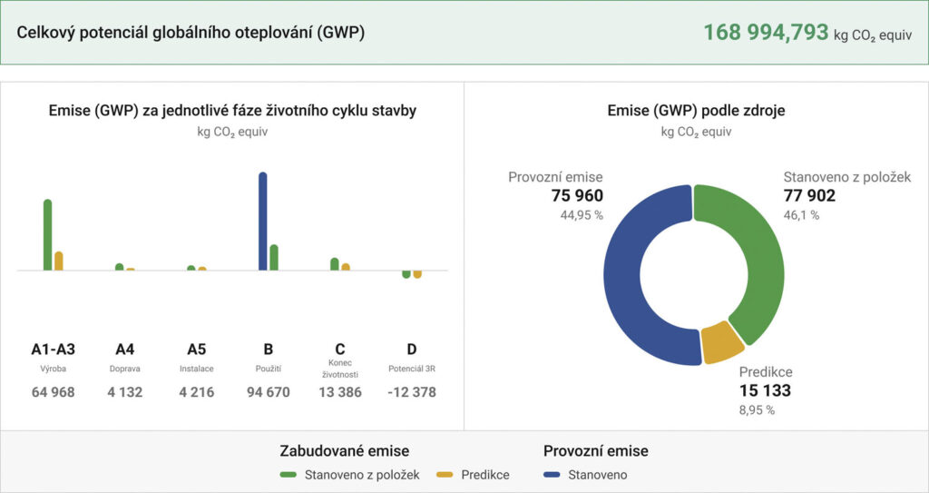 Výsledkem je přesný a přehledný protokol s grafy a údaji, které zobrazují uhlíkovou stopu za jednotlivé fáze životního cyklu stavby. Zároveň ji rozdělují na zabudované a provozní emise, což umožňuje lepší orientaci v tom, kde vzniká největší environmentální zátěž. Spolu s analýzou klíčových dopadů ukazují, které materiály nebo konstrukce tvoří potenciálně největší podíl na emisích – a kde tedy může projektant či investor hledat prostor pro optimalizaci. Všechny takto vytvořené projekty a stavby lze snadno exportovat do pdf nebo sdílet s dalšími účastníky projektu pomocí odkazu (bez nutnosti registrace dalších uživatelů).