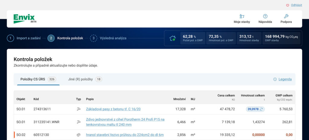 Nová bezplatná webová aplikace Envix od společnosti ÚRS CZ, přináší do stavební praxe zcela nový pohled na environmentální hodnocení projektů. Umožňuje snadno a přehledně vyčíslit emise skleníkových plynů vznikajících v průběhu celého životního cyklu stavby. Od návrhu až po demolici. Od prvního výkazu po výsledný protokol. Jde o první řešení na českém trhu, které nabízí možnost vyčíslení uhlíkové stopy stavby díky propojení rozpočtu stavby s environmentálními daty obsaženými v Cenové soustavě ÚRS – databázi podkladů pro specifika a oceňování stavebních materiálů a prací v ČR. To umožňuje získávat údaje o uhlíkové stopě a dalších environmentálních dopadech s menší časovou a finanční náročností spolu s relativně velkou mírou podrobnosti a přesnosti. Integrace LCA hodnocení do stávajících nástrojů běžně využívaných ve stavební praxi může výrazně usnadnit jeho zavádění do reálného stavebního procesu. Tento přístup odpovídá doporučením akčního plánu metodiky pro výpočet potenciálu globálního oteplování budov v kontextu České republiky, který vypracovalo Univerzitní centrum energeticky efektivních budov ČVUT.