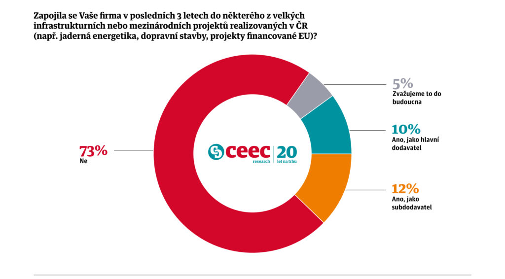 České stavební firmy se do mezinárodních projektů zapojují jen výjimečně. Důvodem jsou především požadavky na reference nebo vysoká vytíženost kapacit. Za poslední 3 roky se takových projektů účastnilo jen 10 % domácích firem v pozici hlavního dodavatele, dalších 12 % jako subdodavatelé. Vyplývá to z nejnovějšího průzkumu společnosti CEEC Research, do kterého se zapojilo 165 stavebních firem.
