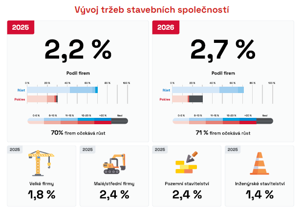 Vyšší tržby předpokládají firmy zaměřené na pozemní stavby, které odhadují navýšení o 2,4 % v roce 2025 a o 2,9 % v roce 2026. Důvodem je snadnější přístup k financování, který zahrnuje podporu bank a hypotéky. Rezidenční a komerční projekty tak mají lepší zázemí pro rychlou realizaci. Pozemní stavby kromě toho podléhají méně složitým povolovacím procesům než velké inženýrské projekty, což zrychluje průběh výstavby a návratnost investic.