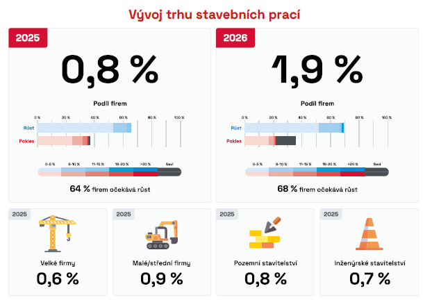 Podle aktuálního průzkumu CEEC Research mají stavební firmy v oblasti staveb pozemních i inženýrských podobné vyhlídky na růst trhu. Ty, zaměřené na inženýrské stavby, předpokládají, že v roce 2025 objem prací vzroste o 0,7 %, zatímco společnosti specializující se na pozemní výstavbu očekávají zvýšeni o 0,8 %. V roce 2026 pak oba sektory odhadují další posun trhu, přibližně o 1,9 %. Tato příznivá očekávání pramení nejen z pozitivních makroekonomických předpovědí. Vláda totiž chystá kroky na podporu dostupného bydlení, což zvyšuje poptávku po pozemní výstavbě – například skrze programy na výstavbu nájemních bytů a rekonstrukce stávajícího bytového fondu. Stabilizace cen stavebních materiálů po předchozích zdraženích navíc firmám usnadňuje plánování a realizaci projektů v obou těchto klíčových sektorech.