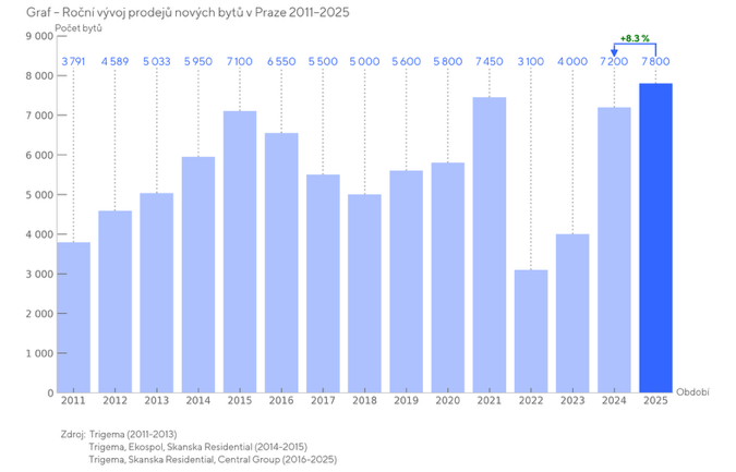 Pražský trh s novými byty má za sebou nejúspěšnější rok za celou dobu, kdy se vedou prodejní statistiky. Celkem se loni v metropoli prodalo 7800 nových bytů, meziročně o 8 % více. Historických maxim dosahují i ceny, které se již přiblížily hranici 180 tisíc Kč/m². Naproti tomu nabídka bytů meziročně o 10 % poklesla a nadále absolutně nedostačuje potřebám trhu. Vyplývá to z tržní analýzy developerských společností Central Group, Skanska a Trigema.