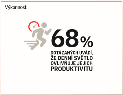 V průzkumu YouGov si 63 % lidí myslí, že denní světlo ovlivňuje produktivitu. Souvislost mezi denním světlem a produktivitou práce v kancelářích byla také podrobně prozkoumána a různé studie ukazují, že denní světlo a výhled z okna zvyšují pracovní výkonnost. Například pracovníci v call centrech zpracovávali hovory o 6 % až 12 % rychleji, když měli co nejlepší výhled oproti těm, kteří neměli žádný3. Ostatní zaměstnanci v kancelářích zase dosahovali o 10 až 25 % lepších výsledků v testech mentálních funkcí a paměti, když měli co možná nejlepší výhled. „Když si uvědomíme, že personální náklady tvoří až 90 % provozních nákladů podniku, musíme si s přihlédnutím ke zjištěným závěrům a zkušenostem položit otázku, zda naše kanceláře a školy poskytují správné prostředí pro myšlení a vysokou produktivitu“, uzavírá Bukolská.