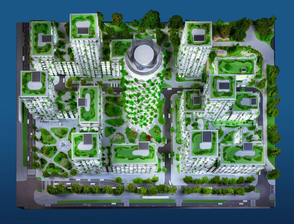 Se svým návrhem Centra Nového Žižkova zvítězila architektka Jiřičná ve velké mezinárodní architektonické soutěži. Odborná porota vybírala z návrhů od 98 ateliérů z 30 zemí světa. Následně pět let probíhaly úpravy vítězného projektu podle požadavků řady různých institucí, aby bylo dosaženo shody na výškách a celkovém řešení zástavby. Nyní tento svůj zásadně přepracovaný návrh představuje Eva Jiřičná veřejnosti. Investorem tohoto unikátního projektu v Praze 3 je největší český rezidenční stavitel Central Group.