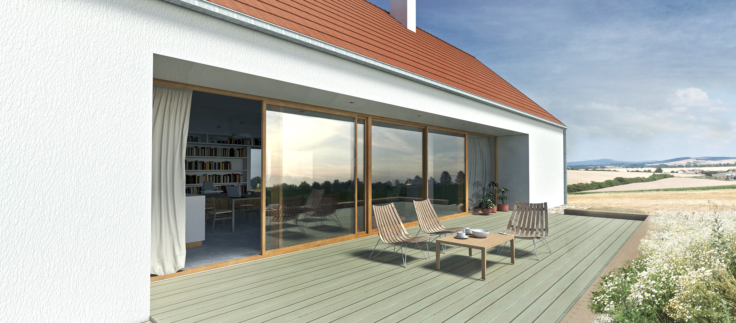 Základní myšlenkou návrhu je návrat k ověřeným a tradičním principům. Dům je půdorysně a funkčně jednoduchý, žije se v přízemí, podkroví se využívá na skladování a jako rezerva. Forma objektu odráží kontext – stodola umístěná na konci zahrady. Dům má ideální oslunění a pasivní solární zisky, zároveň také pomáhá odstínit vítr z polí. Výhled ze zahrady je zachován díky pohledům skrze obytný prostor. Střední francouzské okno je ustoupeno ve fasádě o více než jeden metr do hloubky půdorysu a vytváří přirozený přesah střechy a stínění.