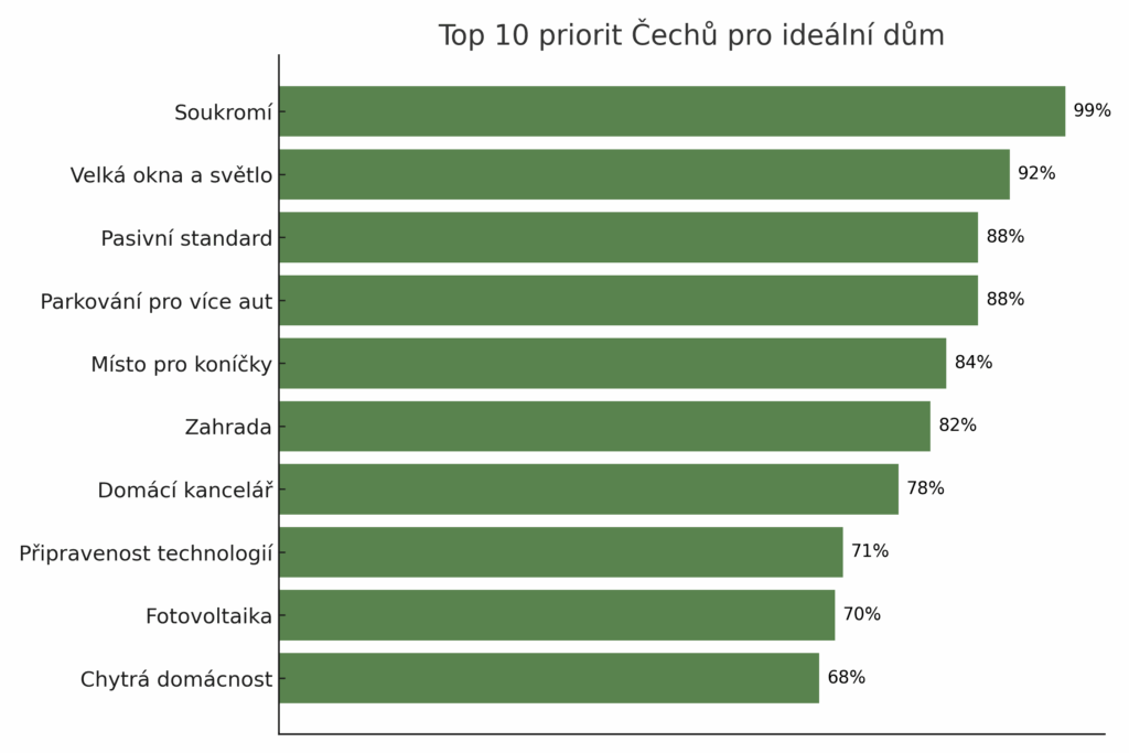 Češi mají jasno: ideální dům musí především nabídnout soukromí, to je klíčové pro 99 % lidí. Pro 92 % Čechů je samozřejmost mít velká okna s dostatkem denního světla. Místo pro více než jedno auto chce 88 % lidí. Stejně důležité je pro ně i to, aby dům splňoval pasivní standard a disponoval energeticky úsporným řešením. Preference bungalovu a patrového domu jsou vyrovnané, 82 % respondentů si ho ale nedokáže představit bez velké zahrady. Vyplývá to z aktuálního průzkumu[1] agentury Ipsos, který si nechala zpracovat společnost wienerberger.