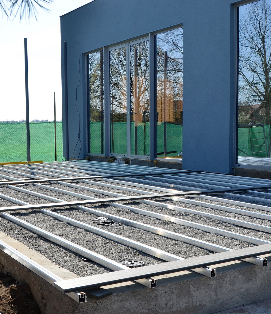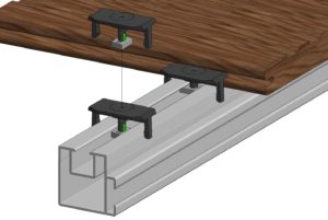 Na předem připravený podklad se umístí hliníkové nosiče, které se použitím spojek a spojovacích trojúhelníků upevní. Následně se pomocí spojovacích klipů upevňují jednotlivá prkna. Při samotné montáži není nutné nic vrtat, pouze pomocí šroubováku se spojovací klipy utáhnou.