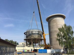 Unikátná technická a architektonická operace na Kladně. Jde o vodojem, který stavěl Kolben a Daněk a nevyužívá se. Místo jeho zboření se investor rozhodl pro unikátní technickou operaci. Více než 90 tun vážící nádrž odříznul, snesl jí na zem a na místě začal budovat novou stavbu, kde bude vyhlídka, muzeum biodiverzity a vodárenský dispečink.