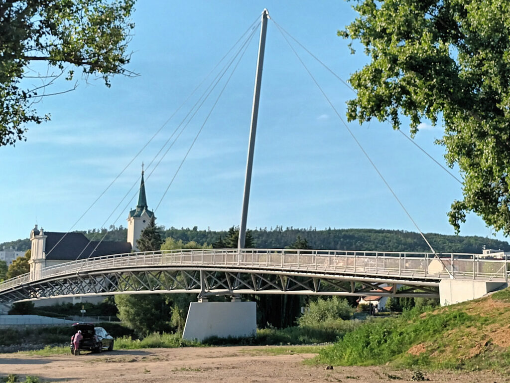 Nová ocelová lávka přes řeku Berounku byla umístěna na stávající upravenou spodní stavbu odstraněné nevyhovující předpjaté betonové konstrukce. Lávka o délce 110 m je na přání architekta zavěšená na jednodříkovém asymetrickém pylonu kloubově kotveném na horním pasu trojboké příhradové konstrukce nad posuvným ložiskem na pilíři. Vzniklo tak řešení, které je tvarově originální (most-plachetnice) a plně funkční.