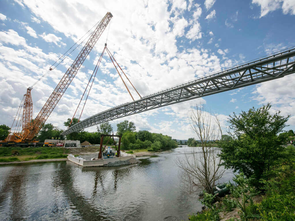 Konstrukce lávky byla svařena z přepravních dílů na pravém břehu včetně žárově zinkovaného roštu pro kompozitní mostovku. Poté byla vcelku jeřábem přemístěna na opěry, pilíř a provizorní podporu v řece.