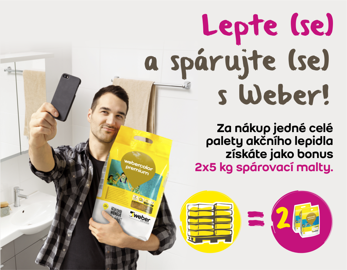 Weber, výrobce a dodavatel špičkových stavebních materiálů, zahajuje prodejní akci na lepidla na obklady a dlažby a pro spárování bez fleků. Za nákup jedné celé palety vybraných akčních lepidel zákazník získá jako bonus 2x5kg spárovací malty webercolor premium zdarma.