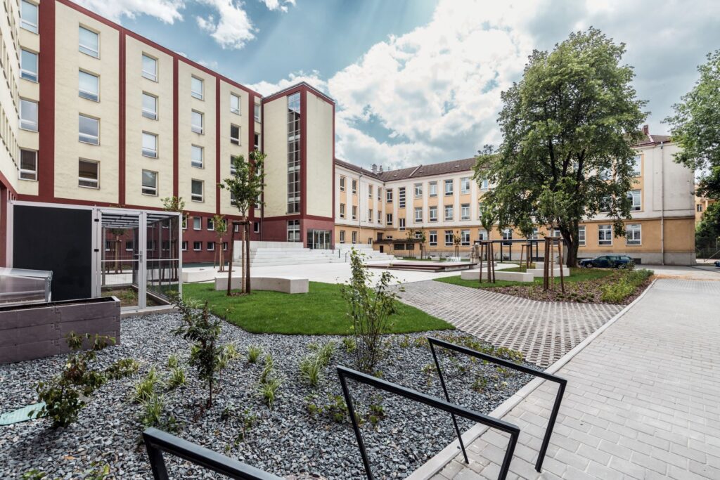 Rekonstrukce školního dvora zachovala centrální nádvoří s fontánou a plastikou (repasovanou). Venkovní prostor doplnila tribuna, která dohromady s dřevěnými pódii navazujícími na vodní plochu vytvořila multifunkční amfiteátr.
