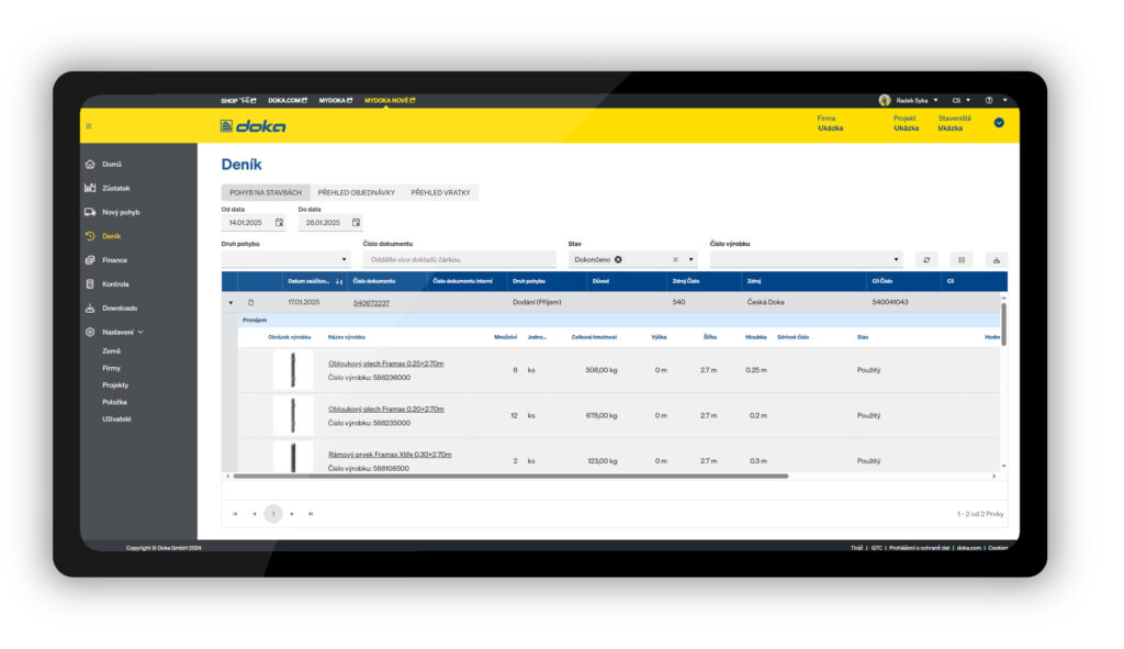 - Správa materiálu v reálném čase – přehled o skladových zásobách, dodávkách i vratkách materiálu Doka.