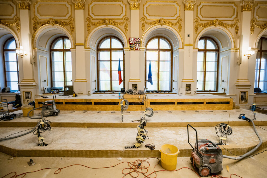 Během letních měsíců probíhá v Thunovském paláci rekonstrukce hlavního jednacího sálu Poslanecké sněmovny. Práce zahrnují výměnu koberce, kamer, které snímají schůze Sněmovny, údržbu hlasovacího zařízení, ozvučení a konferenčního systému. Vedle toho se v jednacím sále provádějí i další opravy, například každoroční renovace lavic a sedadel, malířské a štukatérské práce nebo kontrola a údržba lustrů.