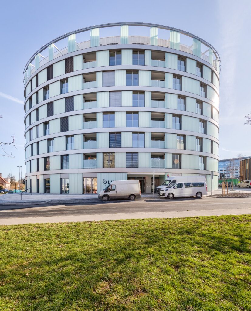 Fasáda Rezidence Olivy je tvořena z neprůhledných, avšak průsvitných skleněných panelů. V kombinaci s matným skleněným zábradlím zajišťuje uživatelům domu vysokou míru soukromí při pobytu na venkovních lodžiích a zároveň neubírá nic ze světelného komfortu v bytech, kterých je celkem 72. Dostatek světla zajišťují také velká francouzská okna, která prostorům dodávají tolik potřebnou vzdušnost. Objekt zároveň disponuje také neobvykle zpracovaným proskleným atriem s panoramatickými výtahy, které tvoří pro obyvatele domu příjemný společný a zároveň společenský prostor. Kromě zajímavého architektonického pojetí a designu, byl projekt vytvořen ve vysokém technologickém standardu využívající například centrálně řízenou rekuperaci vzduchu. Použití kvalitních materiálů a moderních technologií zajišťuje rezidentům maximální komfort, pro které je velkým benefitem také možnost napojení na chytrou domácnost.