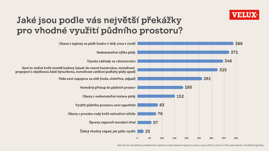 Jedním z nejjednodušších řešení současných problémů s nedostatkem bydlení může být využití půdních prostor. České domácnosti se ale zatím do využívání půdy příliš neženou, a to přesto, že půdu má k dispozici téměř třetina českých rodinných domů či bytů. Z aktuální studie společnosti VELUX vyplývá, že 25 % českých domácností má k dispozici půdní prostor, ale nevyužívá jej. Dalších 10 % pak má místo na půdě upravené k bydlení, ale nebydlí v něm. Pouhá 2 % dotázaných uvádějí, že na půdě bydlí.
