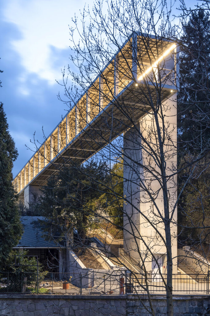 Lávku formují dva identické hranoly: jedním procházíte, druhý má roli výtahové šachty. Díky ní je lávka bezbariérová, ale kdo chce, může jít po schodišti.