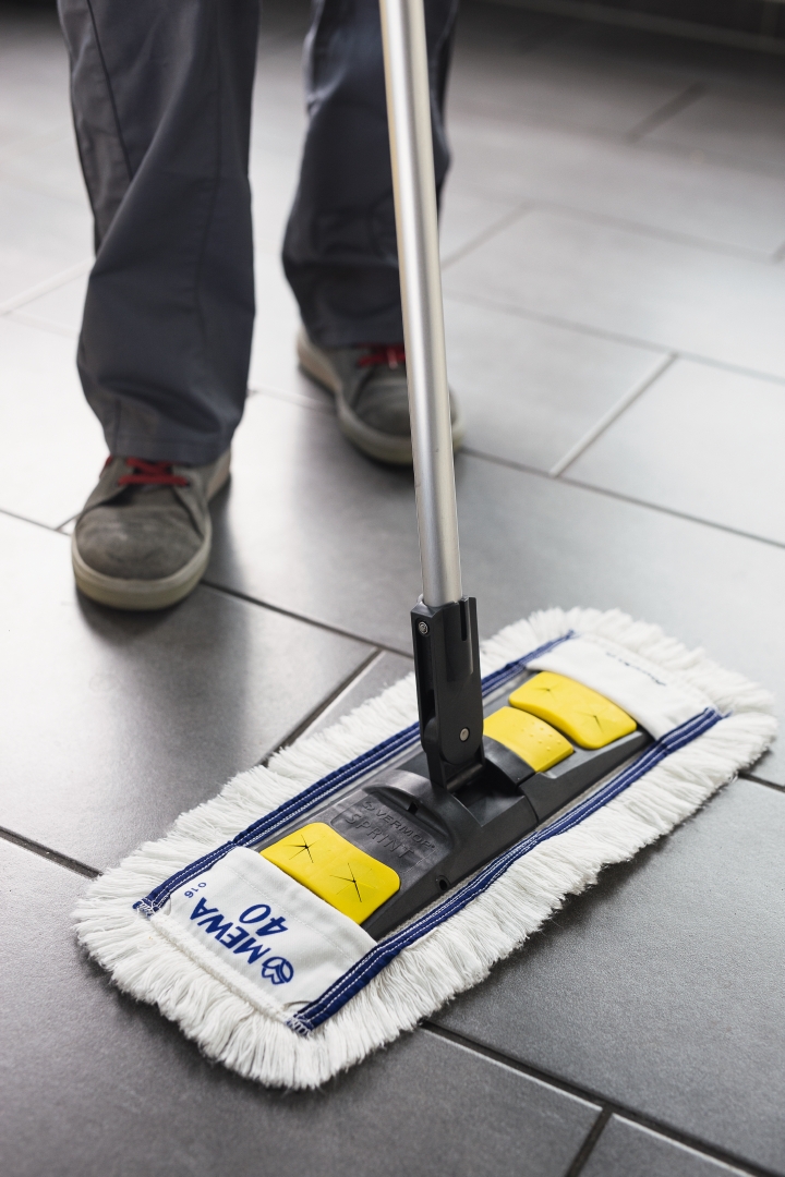 Poskytovatel textilních služeb MEWA nabízí kromě pracovních oděvů také úklidové mopy, které jsou schopné absorbovat obzvlášť velké množství nečistot a zaručují čistotu bez náročného a namáhavého tlačení a drhnutí. Tím se podporuje způsob úklidu, který je šetrný pro záda. Existují tři různé jakosti: mop z mikrovláken pro hladké a lehce strukturované podlahy, plyšový mop z mikrovlákna s vysokou savostí pro silně strukturované podlahy, jakož i tuftovaný mop z polyesteru a bavlněné příze pro všechny hladké podlahy.